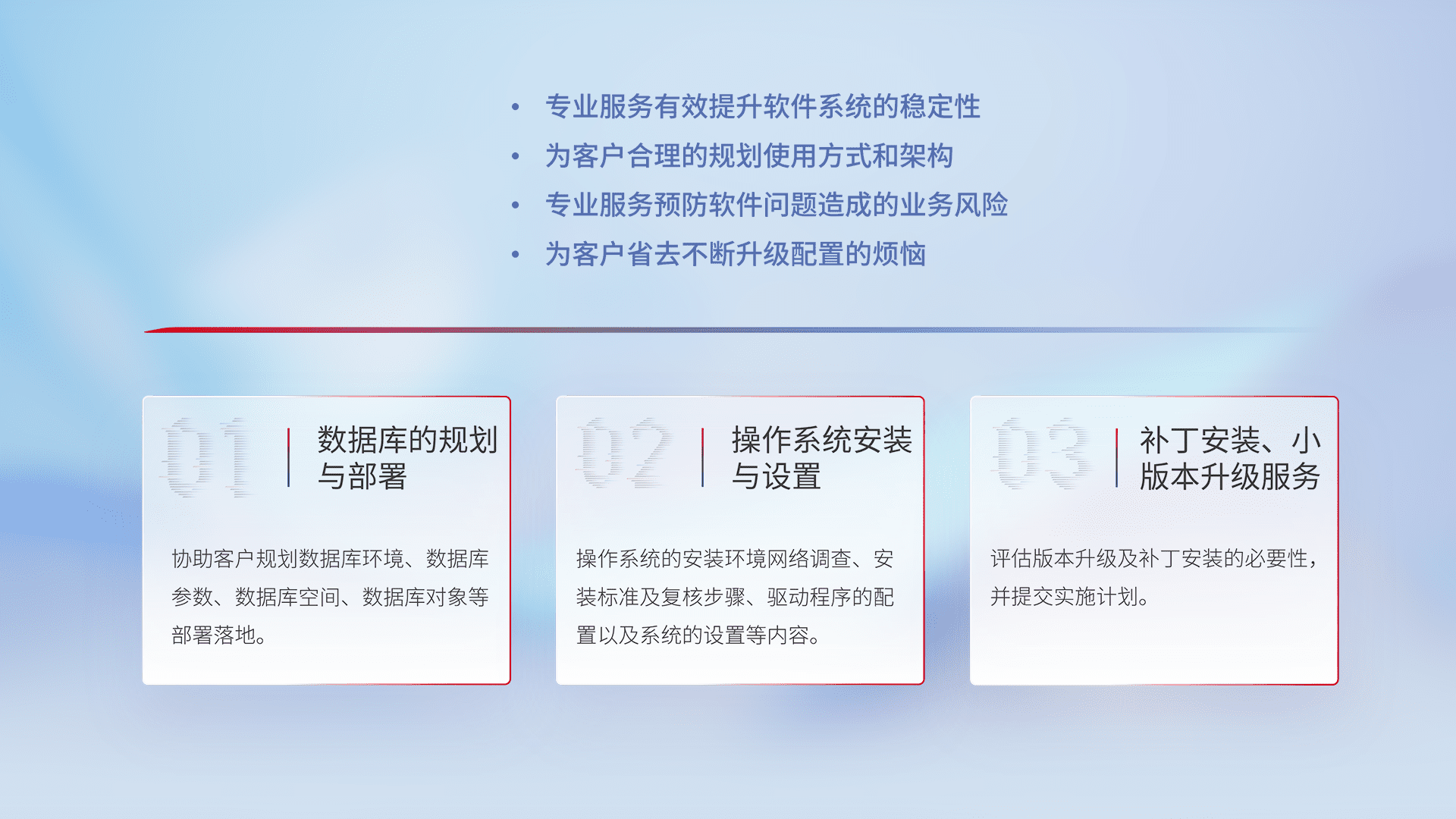 为客户提供软件规模升级、、快速部署、、按需配置的专业服务,,,,从数据库的规划与部署到操作系统的安装与设置,,,再到补丁安装和小版本升级提供支持。。。。